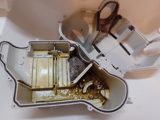 洗剤外ケースになります。黒っぽい汚れが見えます(画像は清掃前、清掃後)
