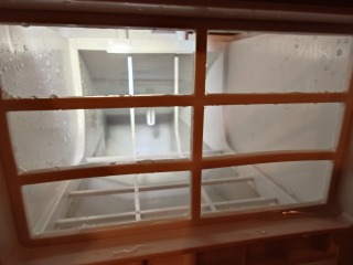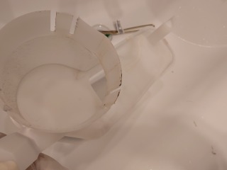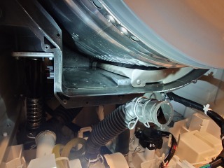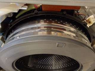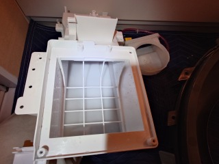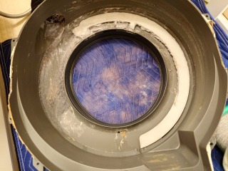 洗濯槽を覆っていた前面カバーには、綿ボコリが付着しています。最近の機種は、カバー部に格子状の窪みを廃止したので、綿ボコリの付着は少なくなりましたが、それでも付着しています。