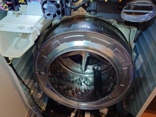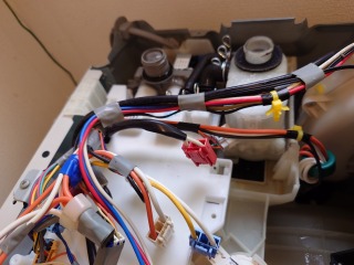 分解前動作確認時に、給水弁の故障を発見しておりました。この機種の場合、給水弁が制御している排出口は3つあり、洗剤用、柔軟剤用、ヒートポンプ(エバポレーター(熱交換器))自動洗浄用なのですが、今回珍しく、ヒートポンプ(エバポレーター(熱交換器))からの吐出がない状態でした。これによりエラーが出ることは無いのですが、自動洗浄できないため、汚れやすくなります