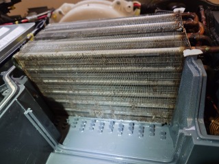この機種のヒートポンプ内部清掃は、標準作業です。エバポレーター(熱交換器)を治具で浮かしてから、清掃しました。ドレン、ドレンホースも清掃範囲に含まれます。