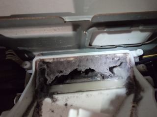 乾燥風路奥側には、綿ぼこりが付着していました。この部位には、可動式のエコフラップがあり、綿ぼこりがエコフラップの密着度を下げてしまうことで、乾燥に影響します。