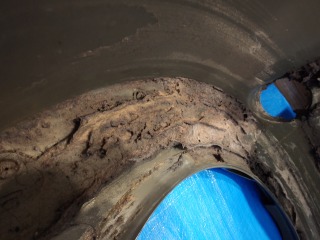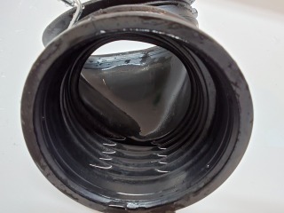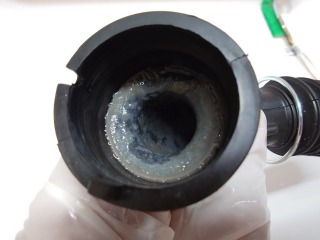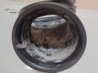 排気ホースを外したところです。綿ぼこりが付着しています(画像は清掃前、清掃後)