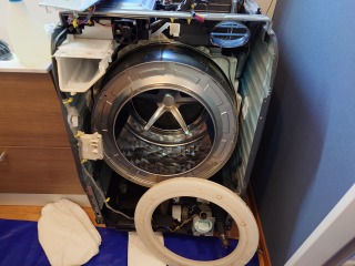 この洗濯乾燥機は、2014年発売開始で当時のフラッグシップモデルです。今回は、洗濯槽を外しての分解清掃(エクセレントコース)を承りました