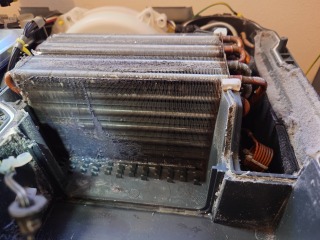 この機種のヒートポンプ内部清掃は、標準作業です。エバポレーター(熱交換器)を中心に汚れが確認できます。
