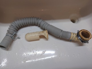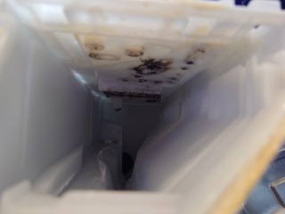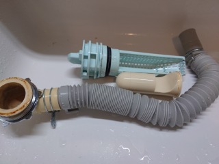 排水ダクト、排水(糸くず)フィルター、排水トラップ、排水口、夫々清掃しました(画像は清掃前、清掃後)