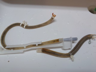 ヒートポンプで発生した結露水が流れるドレンホースの詰まりが酷く、乾燥フィルターに部分に水溜りができていました。ドレンホースを外して詰まりを解消しました(画像は清掃前、清掃後)