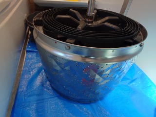 取外した洗濯槽です。軸の部分は、シリコングリースにサビが混ざり量も減っていました。
