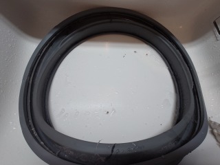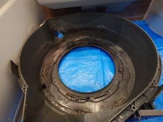 洗濯槽を取外した洗濯水槽です。組み込まれたベアリング部にも綿ぼこりが付着していました。