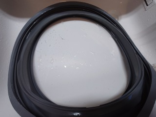 中に入っている水の遠心力で、洗濯槽をスムーズに回すための流体バランサーです(画像は清掃前、清掃後)