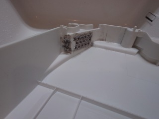 洗濯、すすぎ中に作動する循環水路ダクトです。ここを通った水が戻ってきますので、キレイにしておきたいポイントの1つです(画像は清掃前、清掃後)
