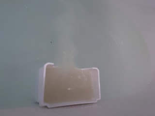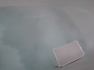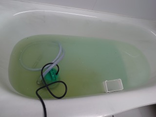 追い焚き配管洗浄の場合、追い焚き配管口の上までお湯はりをしなければならず、その状態で洗剤を入れても、薄くなってしまいます。画像のように配管口の近くに狭い空間を作り洗剤を溶かすと、濃い洗剤を配管内へ送り込む事が出来ます。