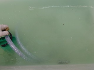 ファインバブルを配管内へ送り込みます。洗浄後、ファインバブルで十分濯いで作業終了です