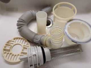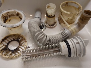 排水ダクト、排水(糸くず)フィルター、排水トラップ、夫々清掃しました(画像は清掃前、清掃後)