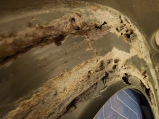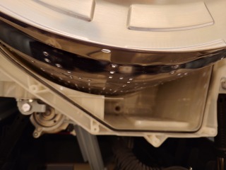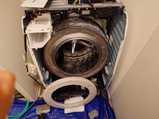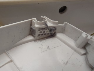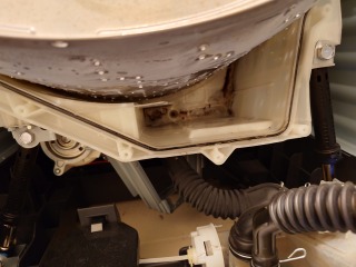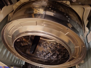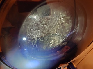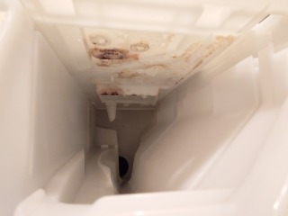 洗濯槽を覆っている前面カバー部には、綿ぼこりが付着していました。この綿ぼこりは、臭いの発生、洗剤(柔軟剤)の無駄、乾燥時間に影響を与えます。