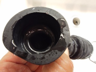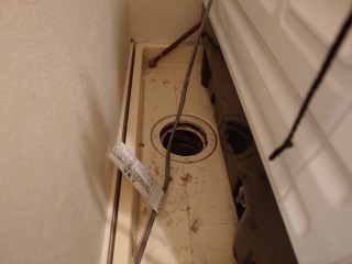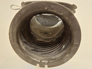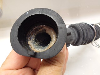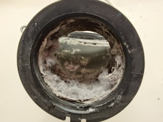 排気ホースを外したところです。綿ぼこりが付着しています(画像は清掃前、清掃後)
