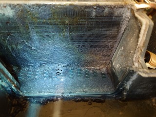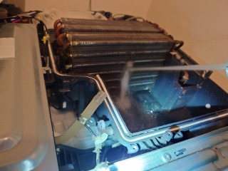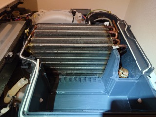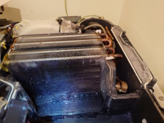 この機種のヒートポンプ内部清掃は、標準作業です。エバポレーター(熱交換器)を中心に、汚れています。この状態は目詰まり状態で、乾燥に直接影響を与えます。