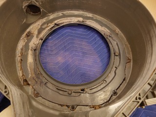 ヒートポンプユニットの蓋裏です。エバポレーター(熱交換器)自動洗浄のノズルが並んでいます。また、画像最下部には、風の通り道があります(画像は清掃前、清掃後)