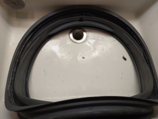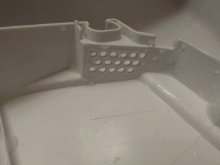 洗濯、すすぎ中に作動する循環水路ダクトです。ここを通った水が戻ってきますので、キレイにしておきたいポイントの1つです(画像は清掃前、清掃後)