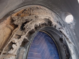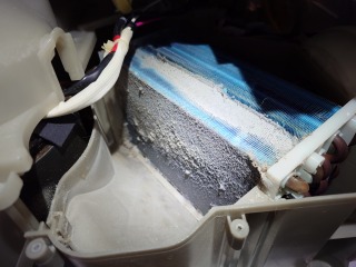 この機種のヒートポンプ内部清掃は、オプション作業です。標準作業でヒートポンプ内部へフレキシブルカメラを入れて、汚れ具合を確認した画像です。エバポレーター(熱交換器)部は完全に目詰まり状態なのが分かります。お客様と相談の上、内部清掃を行う事になりました。