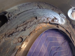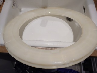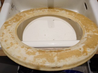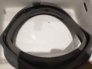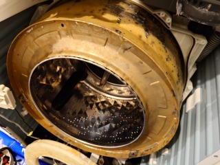 洗濯槽を遠心力の力でスムーズに回すための、流体バランサーです。ケース部を清掃しました(画像は清掃前、清掃後)