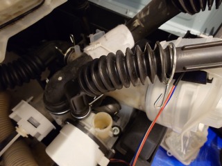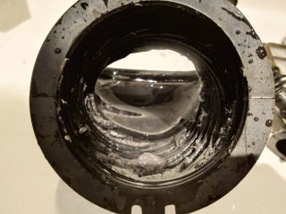 排気ホースを外したところです(画像は清掃前、清掃後)