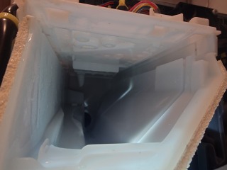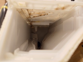 洗濯、すすぎ中に作動する循環水路ダクトです。ここを通った水が戻ってきますので、キレイにしておきたいポイントの1つです(画像は清掃前、清掃後)