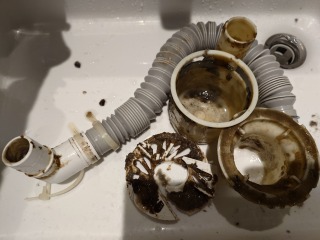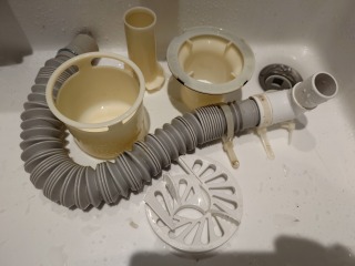 排水ダクト、排水(糸くず)フィルター、排水トラップ、夫々清掃しました(画像は清掃前、清掃後)