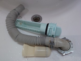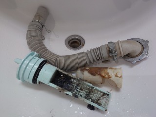 排水ダクト、排水(糸くず)フィルター、排水トラップ、夫々清掃しました(画像は清掃前、清掃後)
