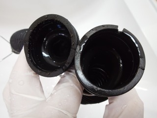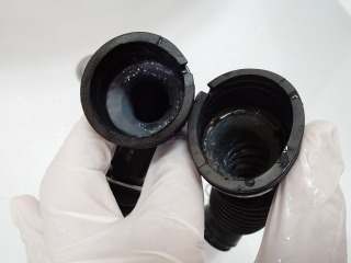 取外した排気ホースです。あまり汚れていません(画像は清掃前、清掃後)