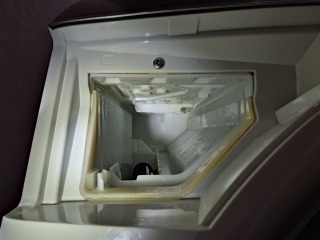 洗濯、すすぎ中に作動する循環水路ダクトです。ここを通った水が戻ってきますので、キレイにしておきたいポイントの1つです(画像は清掃前、清掃後)