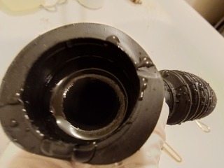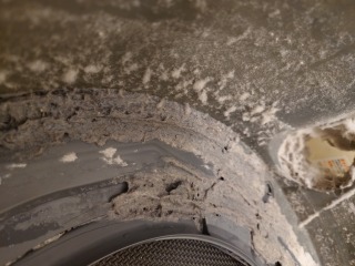 排気ホースを外したところです。綿ぼこりが確認できます(画像は清掃前、清掃後)