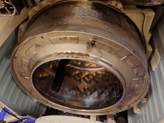 洗濯槽を遠心力の力でスムーズに回すための、流体バランサーです(中に水が入っています)(画像は清掃前、清掃後)