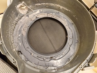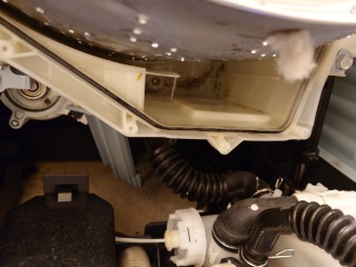 洗濯槽を覆っている前面カバー部には、綿ぼこりが付着しています。