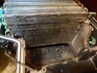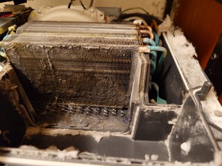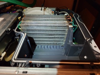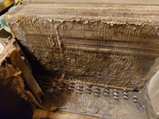 この機種のヒートポンプ内部清掃は、標準作業です。エバポレーター(熱交換器)を中心に汚れが確認できました。