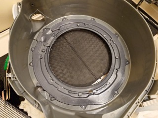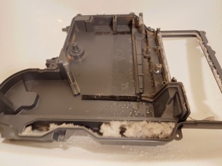 ヒートポンプユニットの蓋裏です。エバポレーター(熱交換器)自動洗浄用のノズルが並んでいます。また、画像最下部の風の通り道は、目詰まりがありました(画像は清掃前、清掃後)