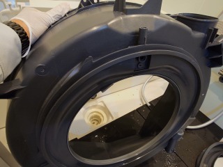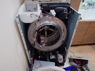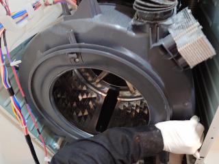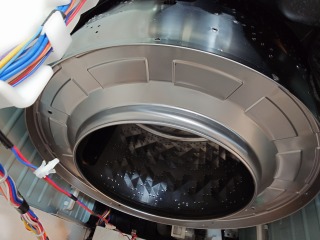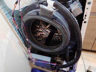 標準作業の分解模様です。洗濯槽を外して清掃を行うエクセレントコースもありますが、まだ1年未満の機種なので、この状態で清掃を行いました。