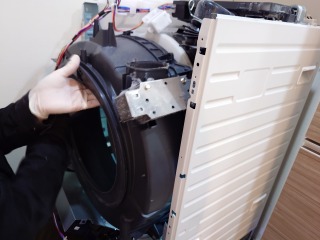 この洗濯乾燥機は、2025年発売開始の最新コンパクトモデルです。使い捨てカイロを一緒に洗ってしまい、黒い粒子が洗濯物に付着するようになってしまったとの事で、分解清掃を承りました。