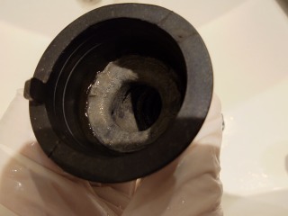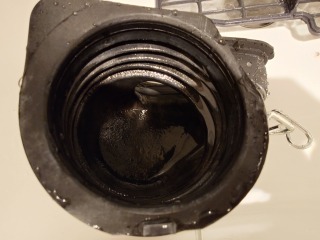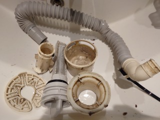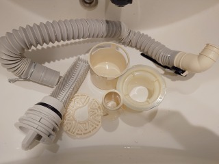 排水ダクト、排水トラップ、排水(糸くず)フィルター、夫々清掃しました(画像は清掃前、清掃後)