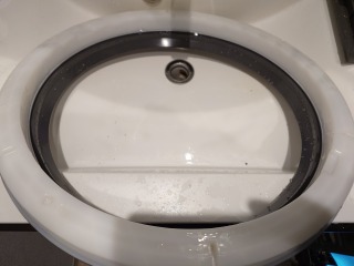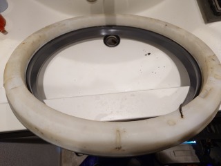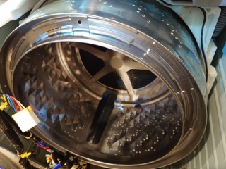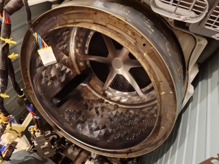 中に入っている水の遠心力で、洗濯槽をスムーズに回すための流体バランサーです。ケース部を清掃しました(画像は清掃前、清掃後)
