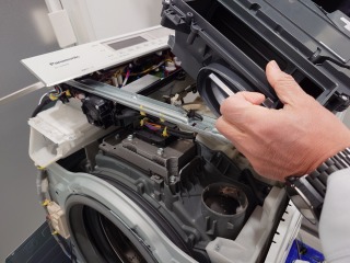 この洗濯乾燥機は、2015年発売開始のモデルです。乾燥状態が悪いのと、洗濯、すすぎ中に作動する全方位シャワーが出なくなっており、ヒートポンプユニット交換と洗濯槽カバーの交換が必要な状態でした。今回は、全体清掃をせず、部品の交換依頼です。