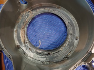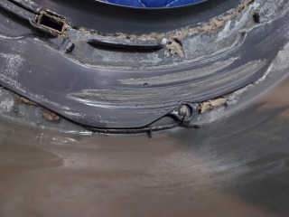 洗濯槽を覆っている前面カバー部には、全方位シャワー用水路が浮いてしまい、洗濯槽との擦り跡がハッキリわかります。全方位シャワーが出ない原因です。このカバーを新品パーツに交換しました。