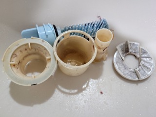 排水ダクト、排水(糸くず)フィルター、排水トラップ、排水口、夫々清掃しました(画像は清掃前、清掃後)