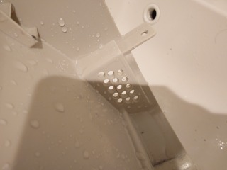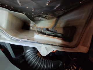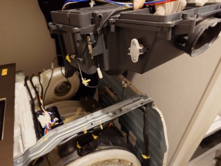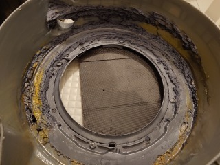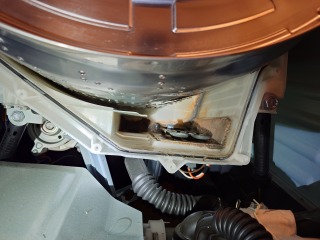 洗濯槽を覆っておりカバーの隙間からは、水の吹き出した跡があり、そこにゴミが噛んでいます。本来、この部位は、水の出るところではなく、全方位シャワー用の水が通る水路になっています。