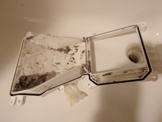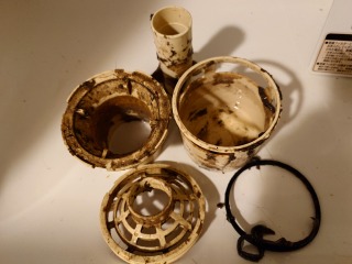排水ダクト、排水トラップ、排水(糸くず)フィルター、夫々清掃しました(画像は清掃前、清掃後)