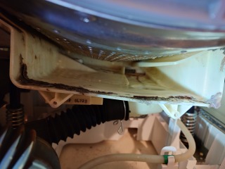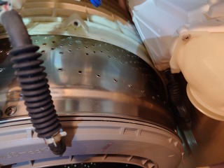 洗濯槽を覆っている前面カバー部には、綿ぼこりが付着しています。