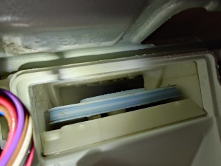 乾燥風路の汚れです。エコフラップ部(水色の板)の綿ぼこりは、稼動板の密着を妨げ、乾燥に影響を与えます。