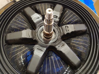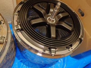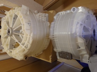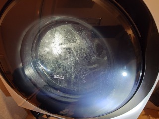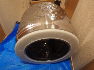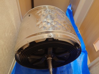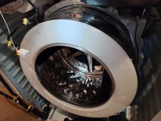 この洗濯乾燥機は、2017年発売開始のモデルです。先日清掃を承り、点検をしたところ、洗濯槽がベアリングの劣化により、洗濯水槽と擦りながら回転し、更に洗濯槽を覆っている前面カバー部にも擦っていた(前も後ろも擦っているという事)ため、お客様と相談の上、清掃を行わず、洗濯水槽、洗濯槽、洗濯槽カバー(前部)を交換することになりました。