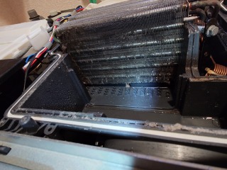 今回ヒートポンプは、清掃しました。いつものようにエバポレーター(熱交換器)を上方に浮かしての清掃です。