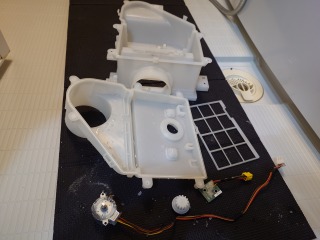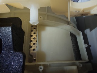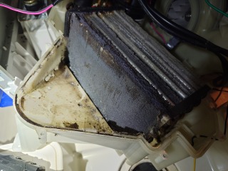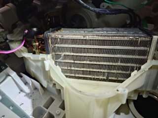 ヒートポンプユニットの蓋を外したところです。エバポレーター(熱交換器)は目詰まり状態でした。