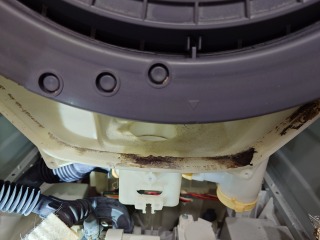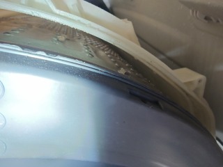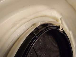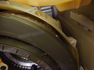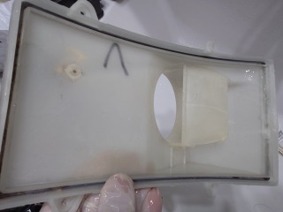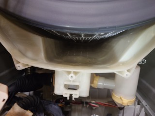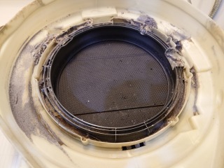洗濯槽を覆っている前面カバー部には、綿ぼこりが付着しています。